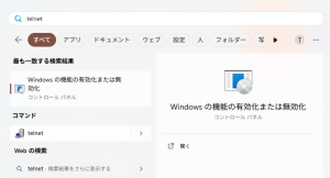 スタートメニューの検索で telnet と入力すると「Windows の機能の有効化または無効化」がでてくるので、起動する。