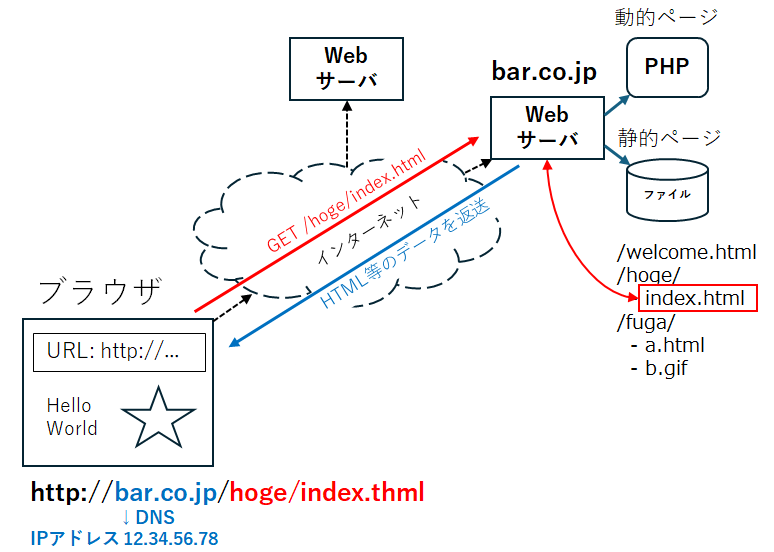 このような予め保存されているWebページを返送する場合は静的ページと呼ばれる。サーバのデータベースなどを参照しながらページ内容を返送する場合は、動的ページと呼ばれ、Webサーバ内部でプログラムを動作させ、その結果のデータをブラウザに返す。